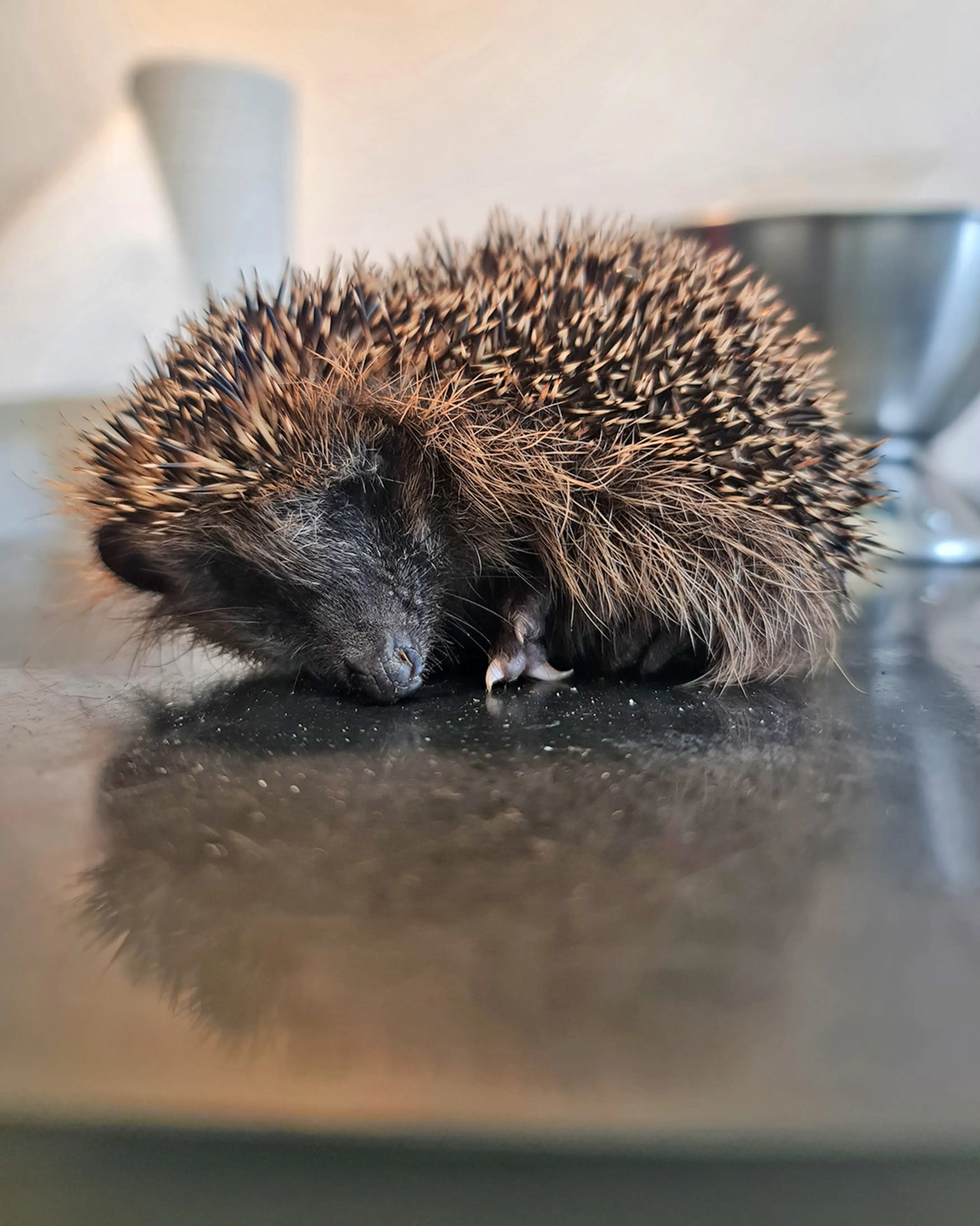 Bei einer Stachelkugel haben wir nur begrenzte Untersuchungsmöglichkeiten. Der Ernährungszustand, Milbenbefall, Verletzungen – all das können wir nur erkennen, wenn sich der Igel öffnet. Auch ein Blick unter den Bauch ist wichtig, um sein Geschlecht zu bestimmen oder Auffälligkeiten zu erkennen. Igel, die humpelnd gefunden wurden, sollten zusätzlich ein paar Meter bei uns laufen, damit wir mögliche Probleme im Gangbild erkennen können.
