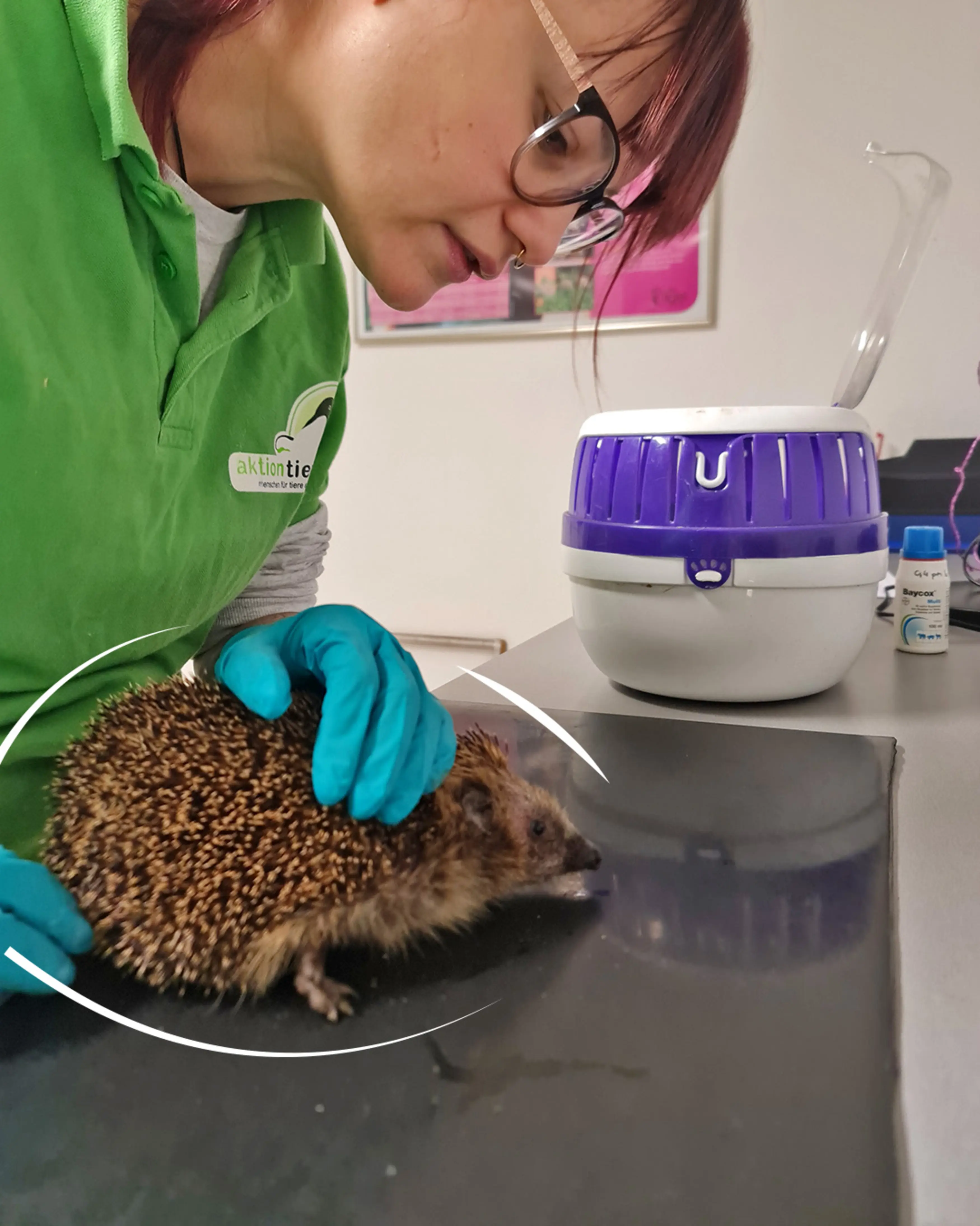 Nun wird der Igel von uns in unseren Untersuchungsraum gebracht. Hier wird er gewogen, von Parasiten befreit, sein Geschlecht wird bestimmt und wir beurteilen seinen Gesundheitszustand. In dieser Untersuchung entscheidet sich, ob er zur Behandlung aufgenommen wird, wieder ausgewildert werden kann oder – falls möglich – zur Pflege zurückgenommen wird. In diesem Fall wird der Igel aufgenommen.
