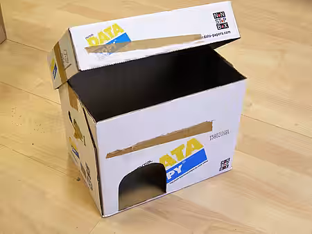 Die Boxenhälfte, in die das Schlafhaus kommen soll, legen wir mit mehreren Lagen Zeitung auf dem Boden aus. Jetzt stellen wir das Schlafhaus hinein, so dass die beiden Eingangslöcher deckungsgleich sind. Rings um das Schlafhäuschen stopfen wir nun Zeitungs-Knüllpapier. Es muss ziemlich fest gestopft werden, denn es soll erstens das Schlafhäuschen auf seinem Platz gut fixieren, und zweitens stellt es die wichtigste Temperaturisolation für unseren Igel dar. Auf das Dach des Schlafhäuschens schütten wir das Knüllpapier etwas lockerer, und zwar so viel, dass fast die Oberkante der großen Box erreicht ist. Darauf legen wir noch eine dicke Lage ungeknüllte Zeitung. Zuletzt kleben wir mit Klebeband das zweite einzelne Pappstück als Deckel auf die Schlafseite der Box.