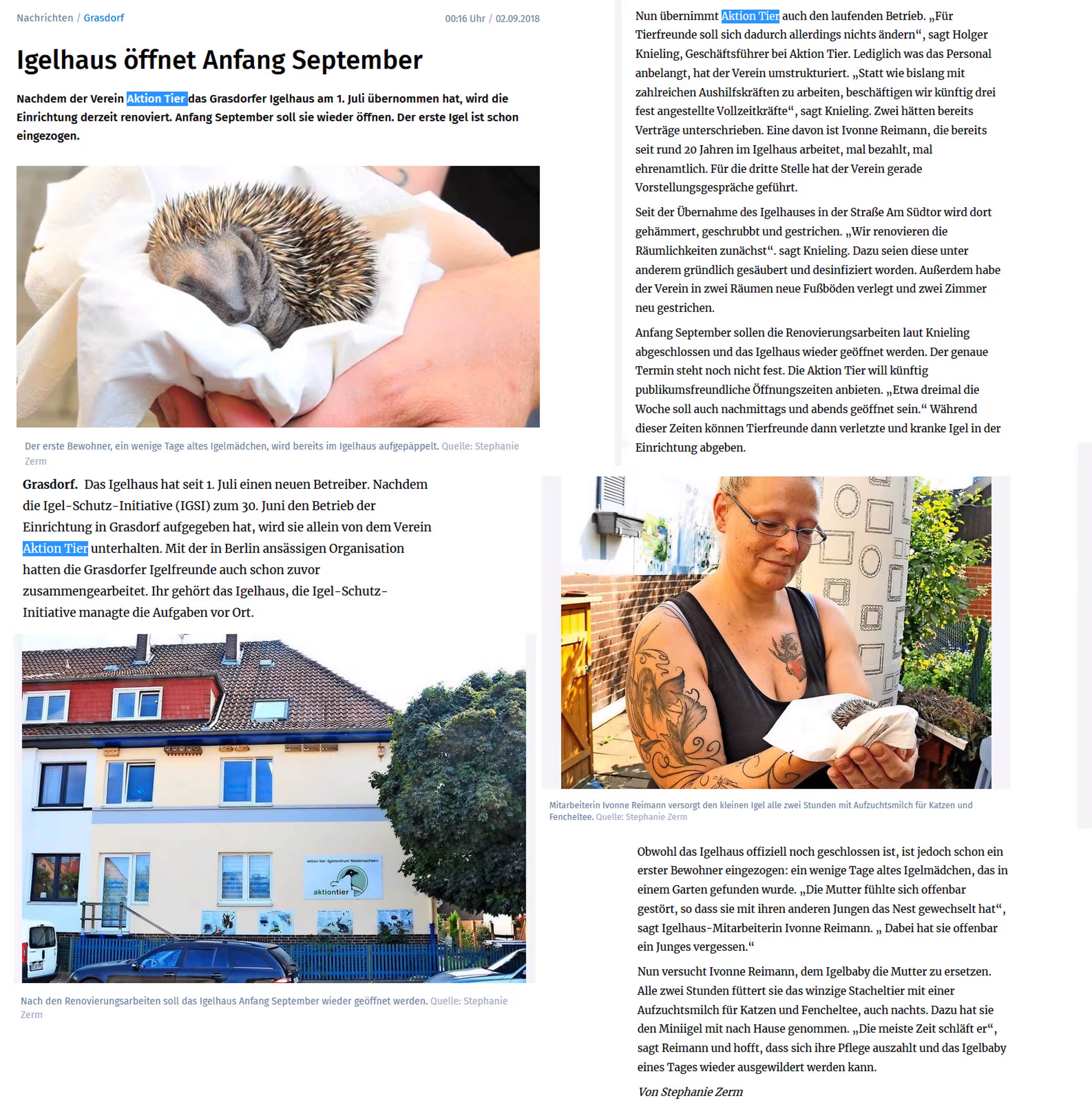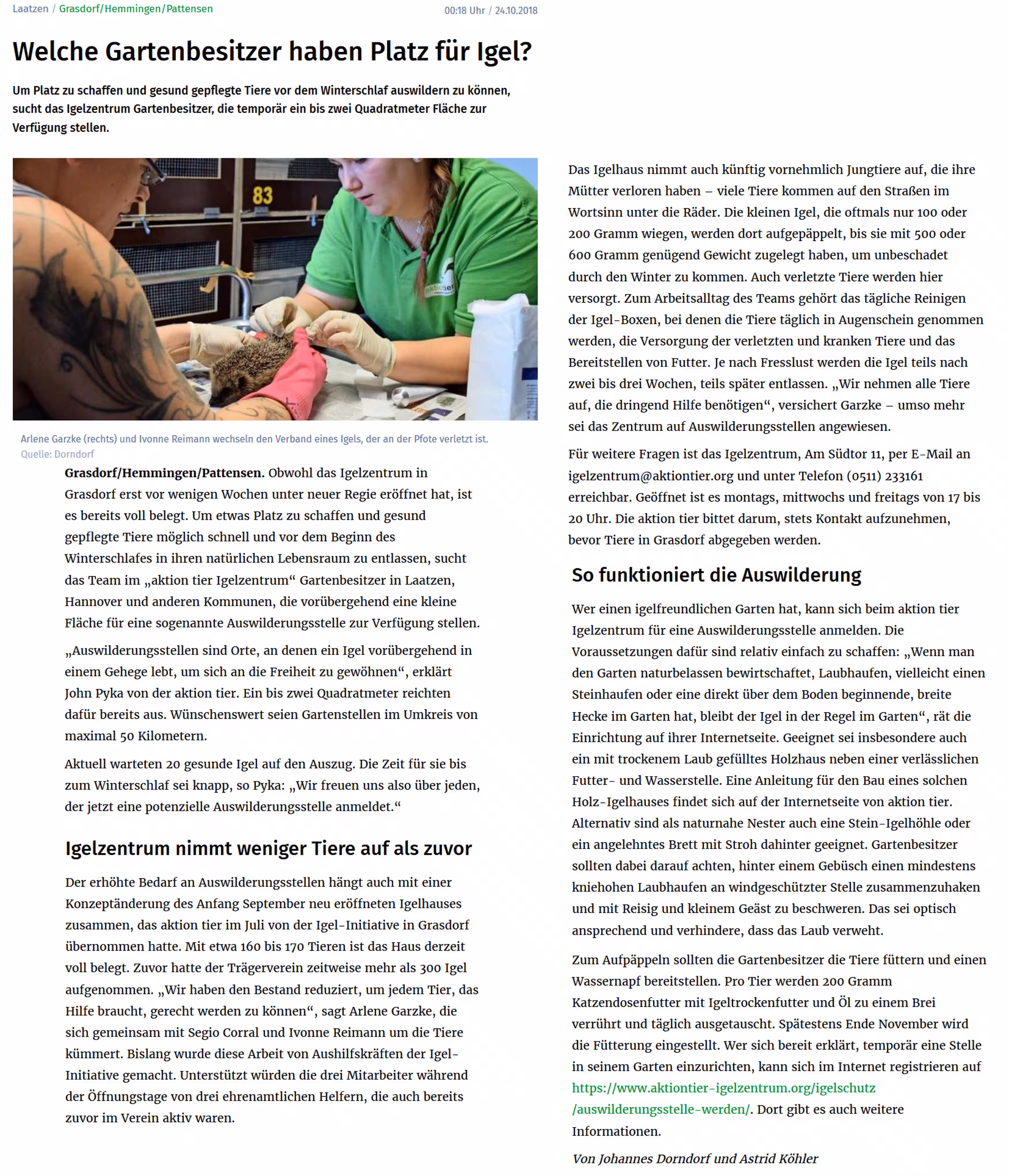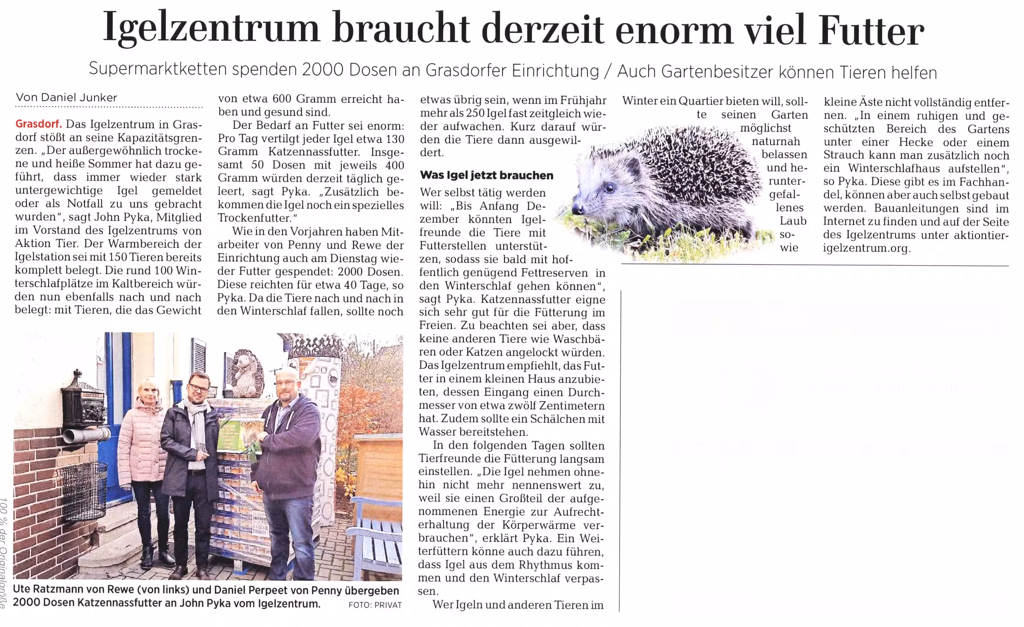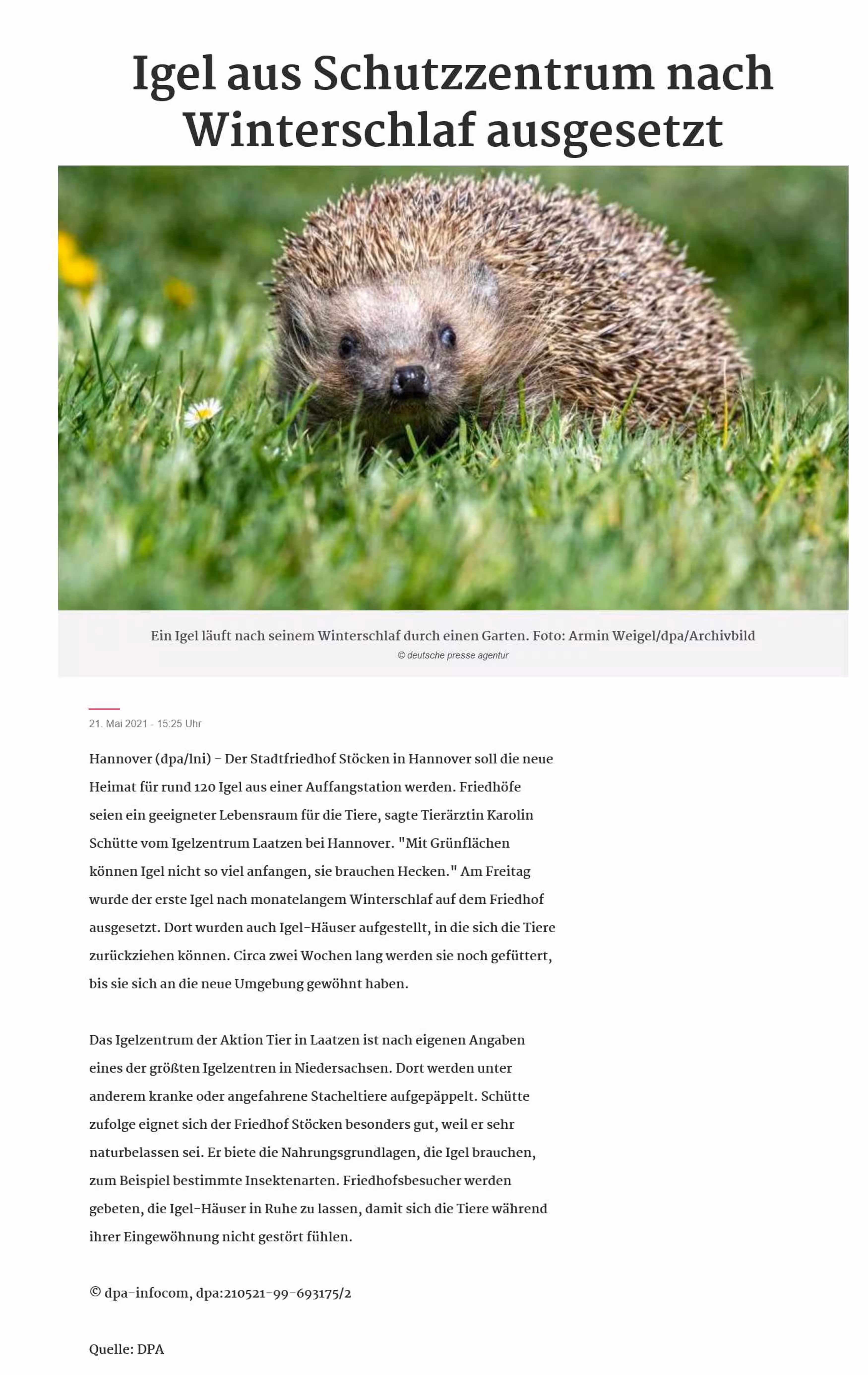 Beitrag über das aktion tier Igelzentrum in der HAZ vom 22.08.2025